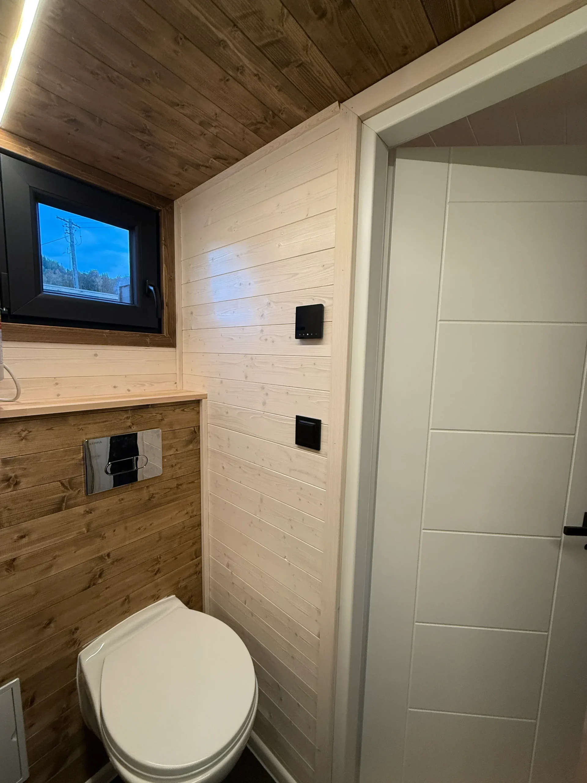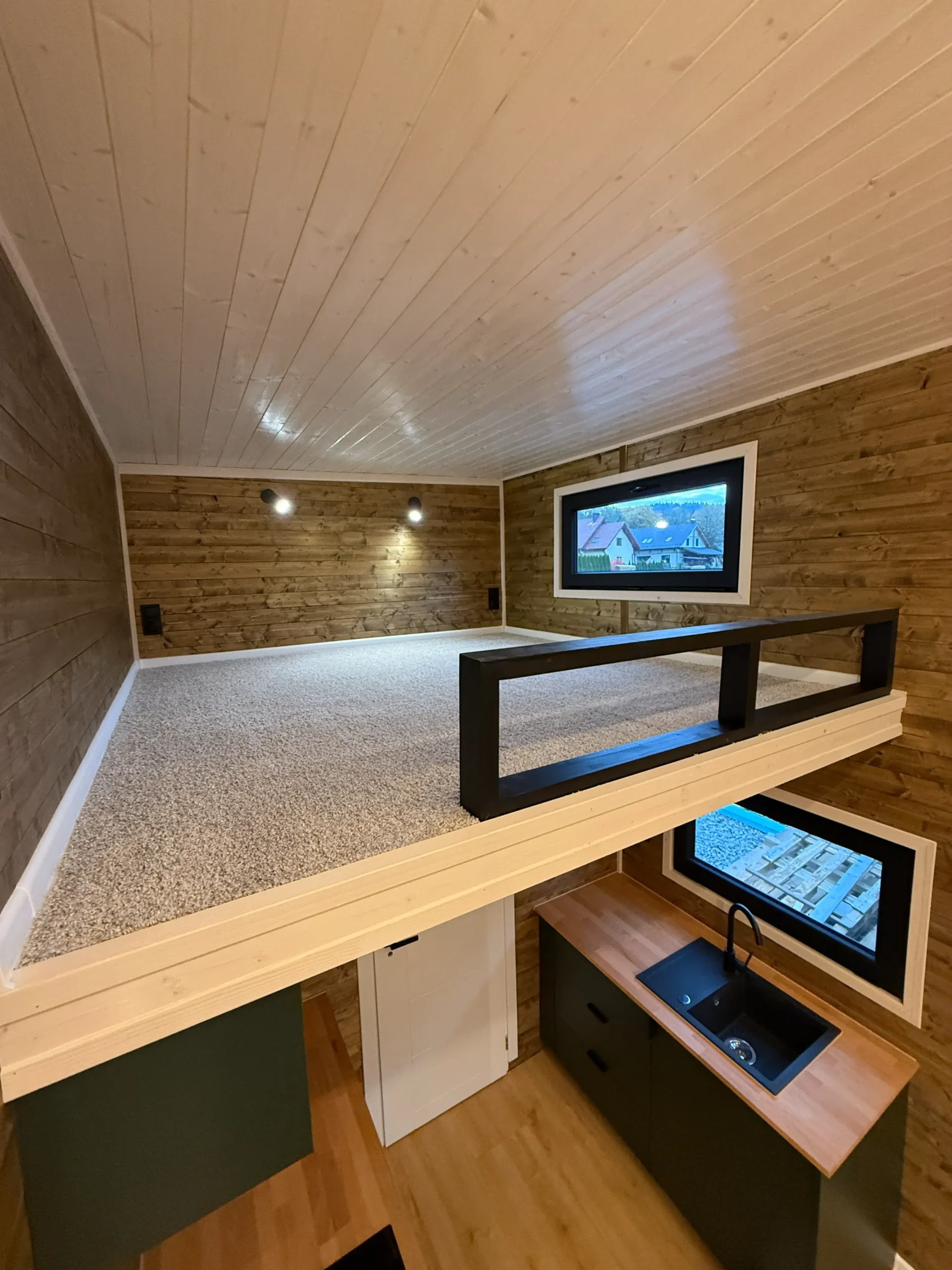 The interior is finished with 1.2 cm thick spruce boards, creating a cozy, natural space. The house features two sleeping lofts with a total area of 7 m². Thermal comfort is provided by underfloor heating throughout the space (kitchen, living room, bathroom) using heating mats controlled via Wi-Fi from a phone. Additionally, a 2.7 kW air conditioning unit with heating function has been installed, also remotely controllable.