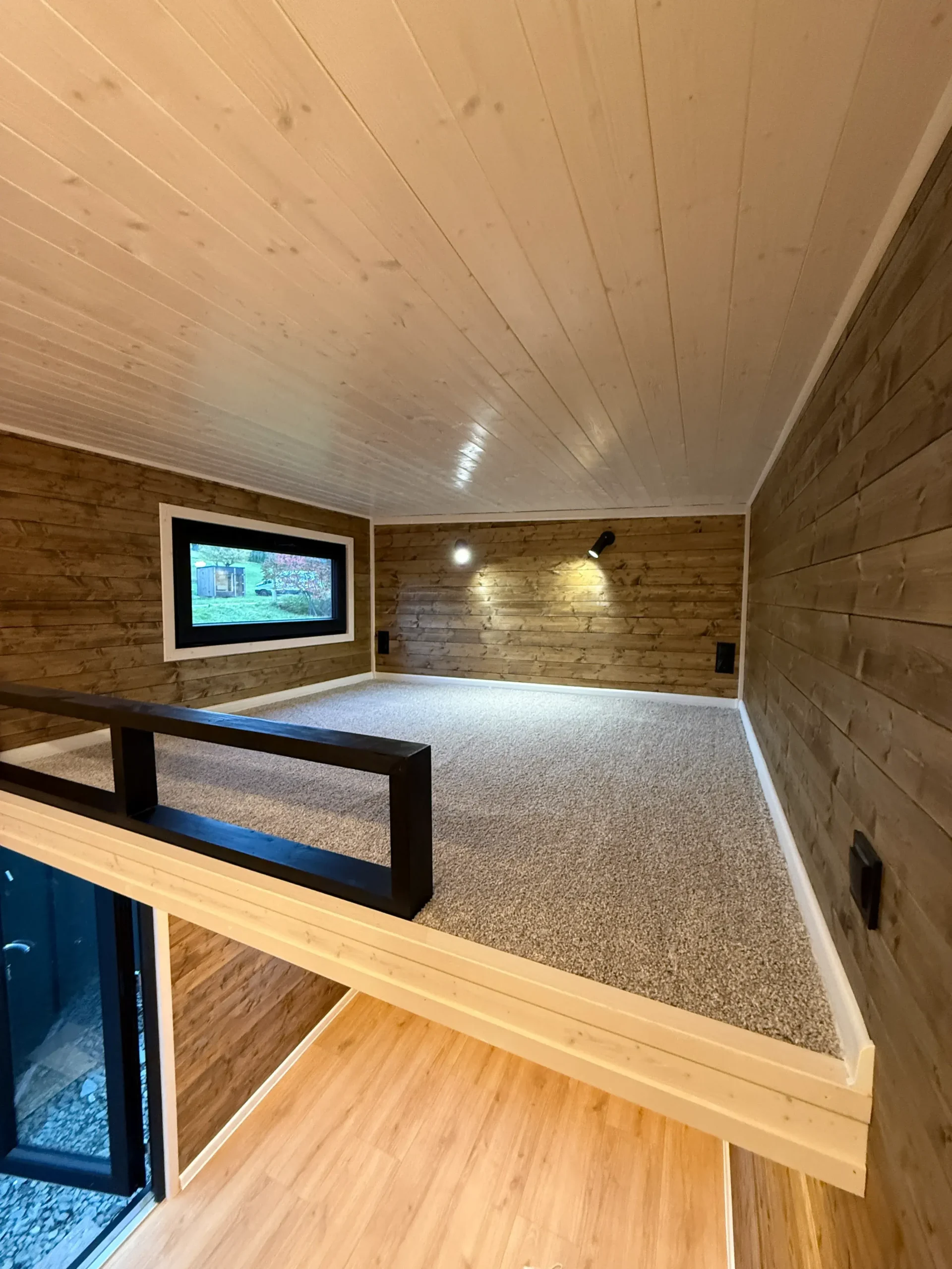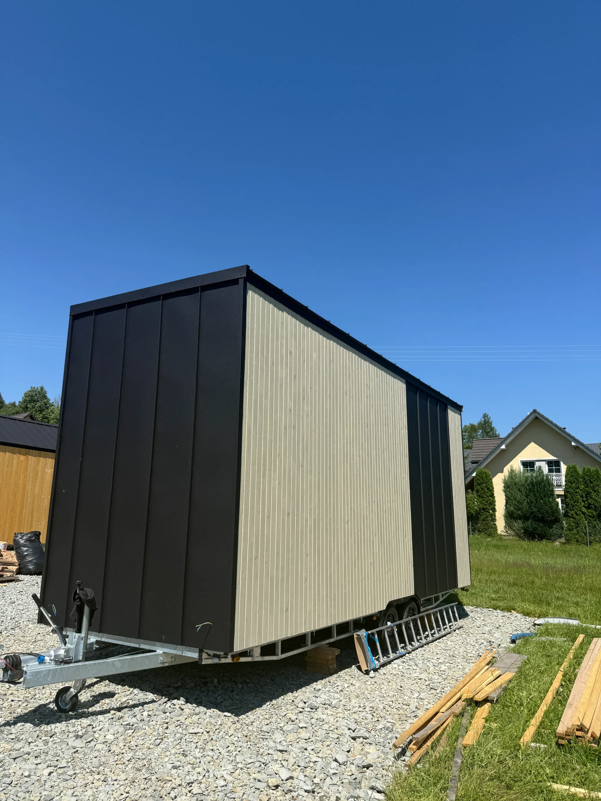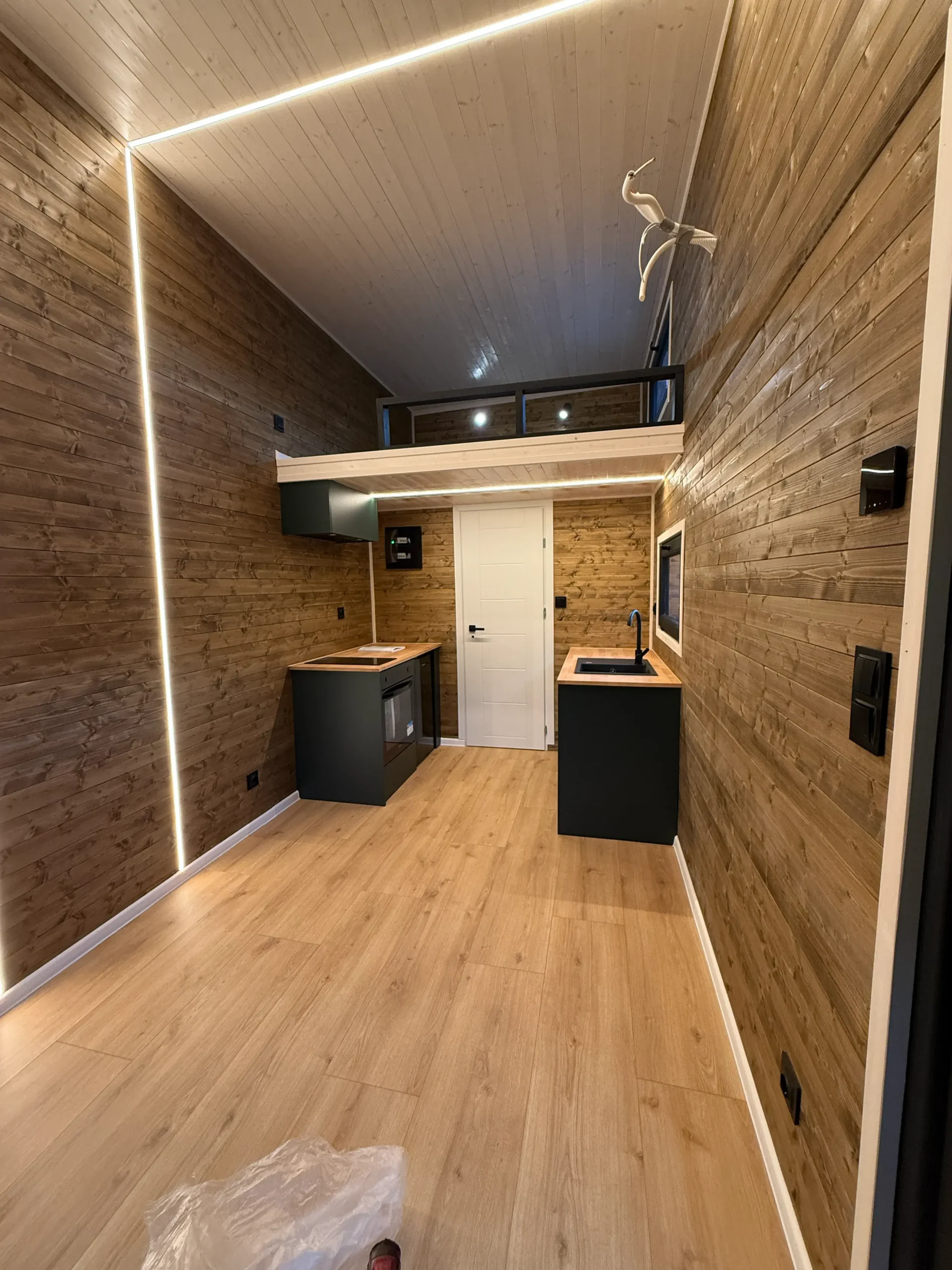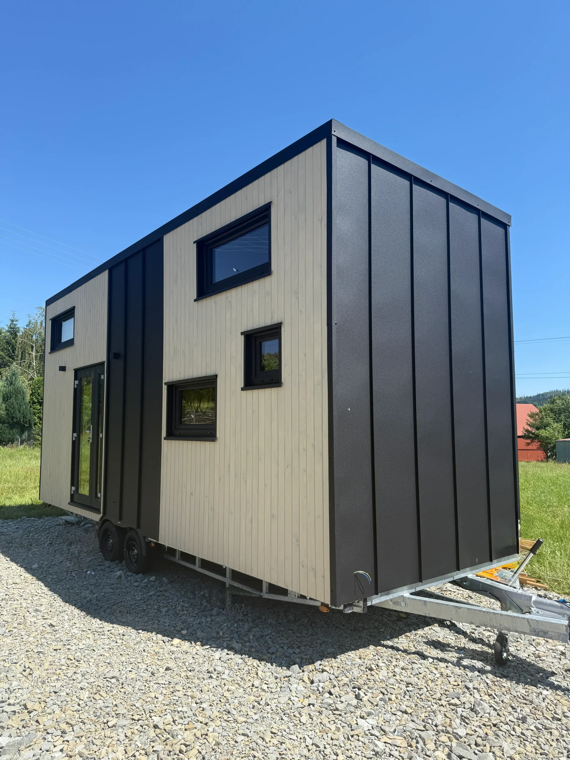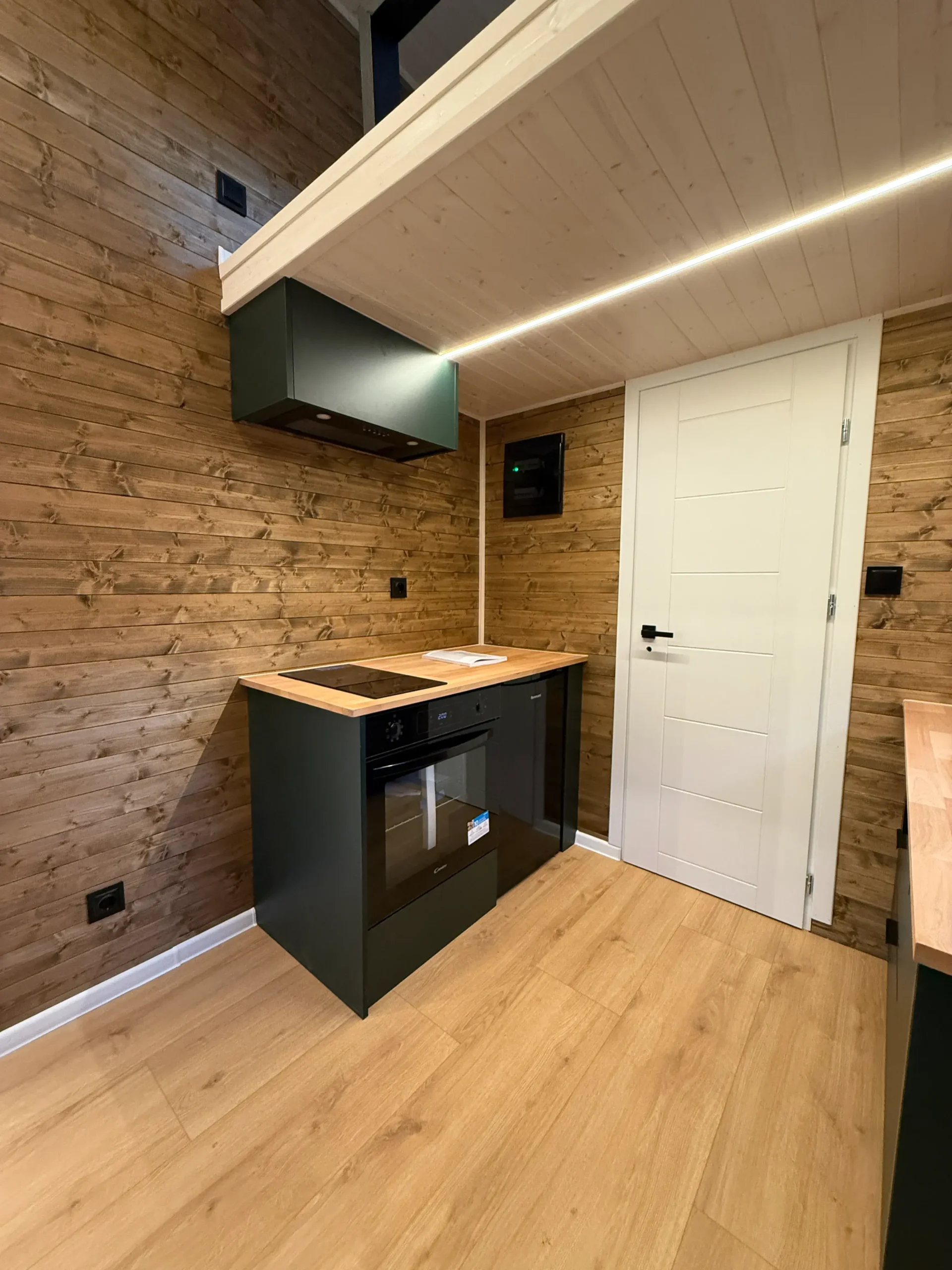 The LINEAR model is a fully functional Tiny House built on an approved trailer, ready for transport and use. The structure is made of C24-grade wood, and the entire building is solidly insulated – walls and roof are filled with 10 cm mineral wool (λ 0.031), while the floor is constructed with 8 cm PIR sandwich panels. Additionally, wind and vapor barriers have been installed, ensuring year-round comfort.